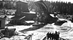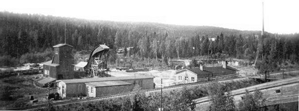 ja olivat aikanaan hyvin tehokkaita. Kuva alla: Kaivoksen 150 m tasolla työnjohtaja Tauno Harkonmaa kaivosmiehineen, karbidilamput toiminnassa. ![]() Kuva alla: Hissipiha. Vas. vintturihalli, keskellä malmihissi ja oikealla henkilöhissi. Kaivoksen henkilökuntaa radan ylittävällä kulkusillalla. Vinttureiden vaijerit näkyvät selvästi. ![]() Kuva alla: Piirros keskuskuilusta ![]()