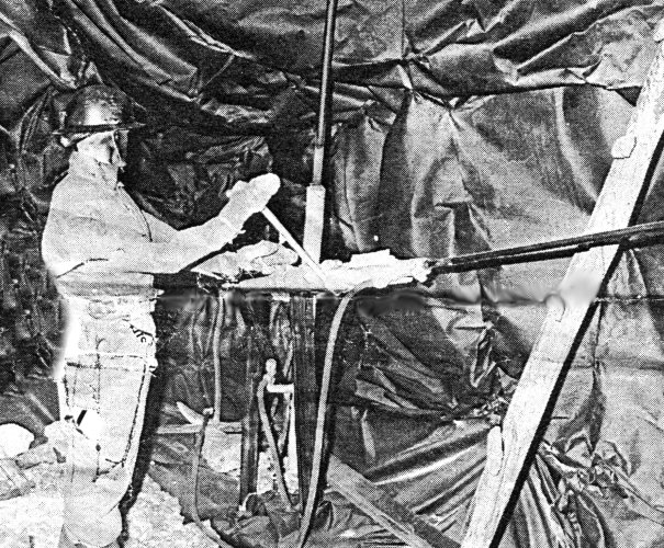 "hännästä". Pora tuettiin kallioon paineilmalla